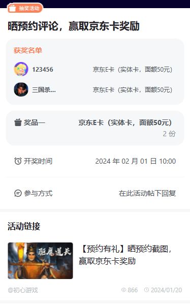 【🎁奖品内容】✨随机抽取2名幸运玩家,每名玩家送出京东E卡1份(实体卡50元面额,以最终实物内容为准)【🎁参与方式】已经点击预约游戏的玩家在本贴内回复预约评论截图即可参与抽奖(ps:不可盗用其他玩家截图)