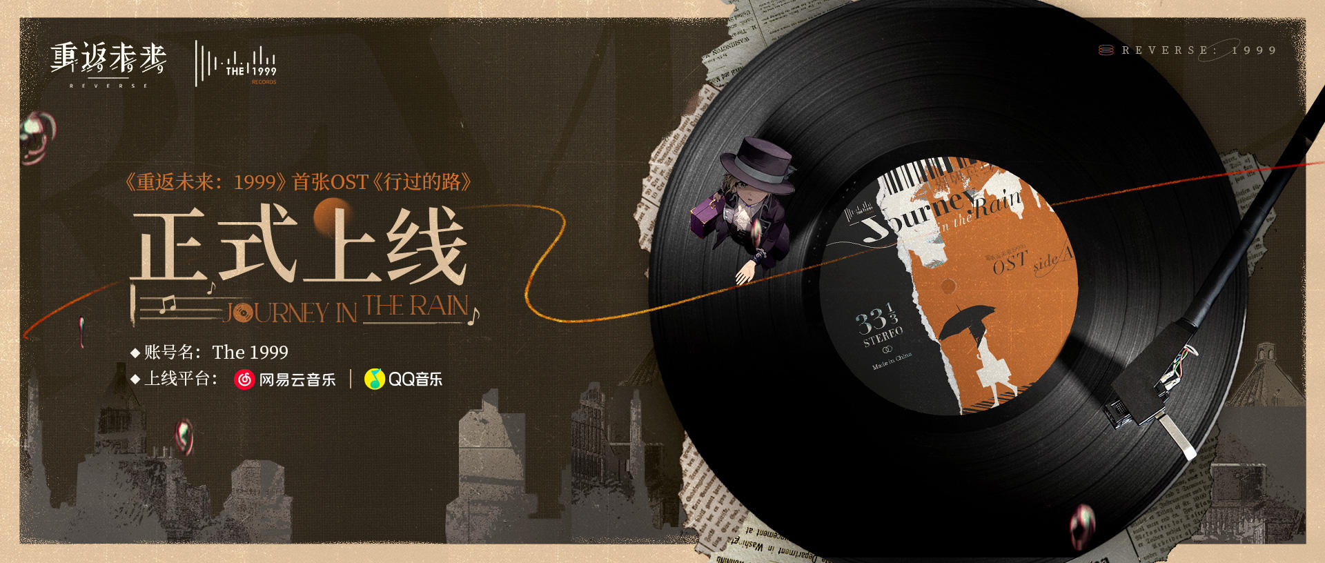 1月20日 《重返未来:1999》第一张OST《行过的路 Journey in the rain》已正式上架网易云音乐及QQ音乐等平台。