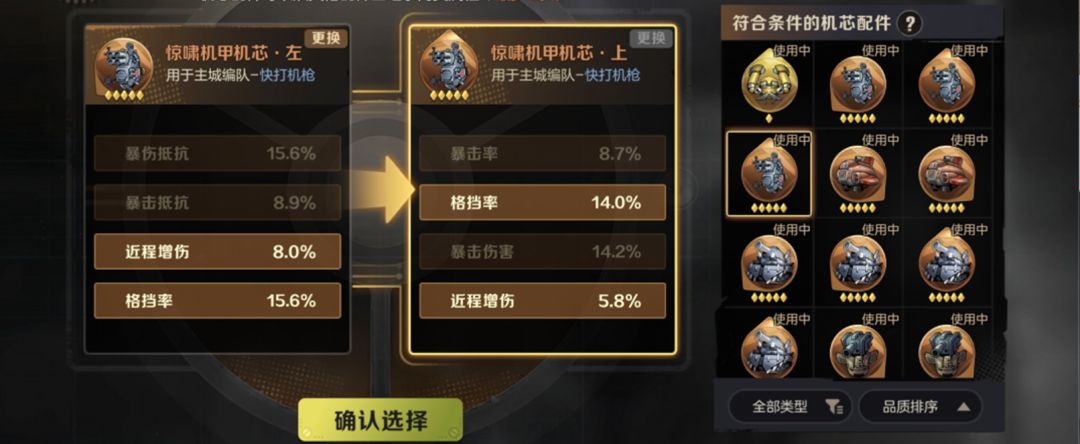 值得注意的是,满足继承条件的机芯品质需为稀世VI级,并且机芯配件要经过鉴定后才能使用,指挥官们可以在配件继承界面查看符合条件的机芯。不仅如此, 每条属性继承时需消耗1枚配件继承卡。