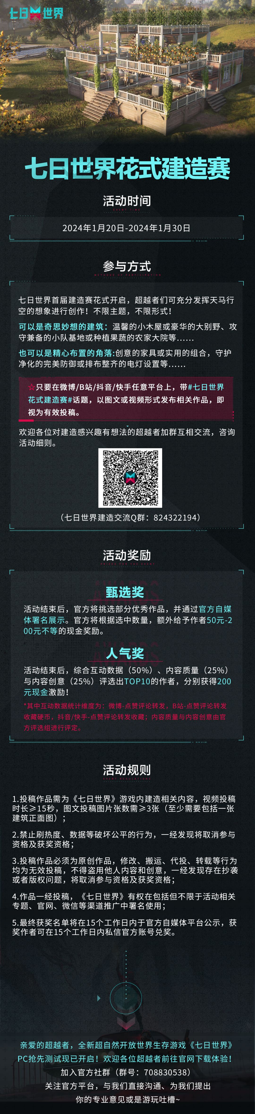 活动期间,带#七日世界花式建造赛#话题,在微博、B站、抖音、快手任意平台发布相关内容参与投稿,即视为成功,更有机会获得现金奖励。