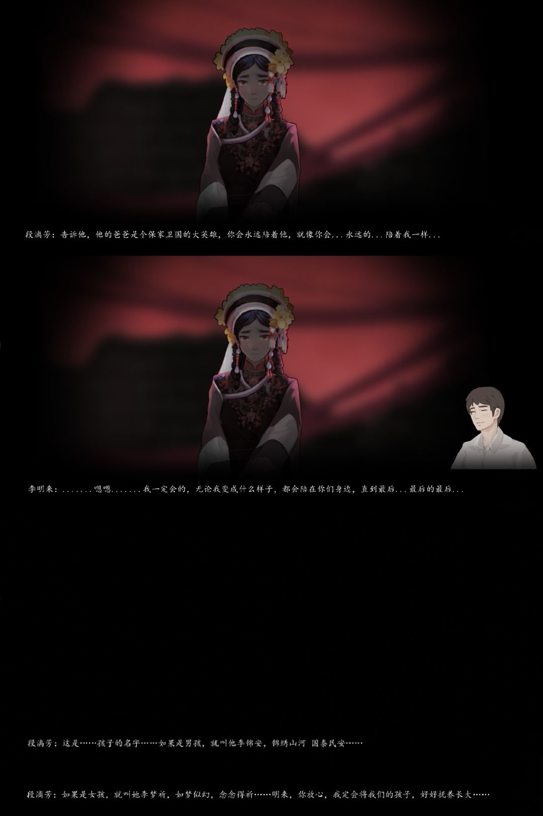 7.7小时,结束了。李明来历经磨难终于找到了段漓芳,更确切来说,是段漓芳创造机会费尽千辛万苦见到了李明来最后一面。从纺织厂小区,到天马村,再到阴阳街,最后到彼岸花海,漫漫长路、寂寂黑夜,李明来、段漓芳夫妻二人终于相见。无尽的黑夜,不曾停歇的大雪,都在见证着李明来浴血奋战、保家卫国,见证着段家为国为民、满门忠烈,更见证着无数的先烈为民献身、为国捐躯,他们所祈盼的锦绣山河、国泰民安,不再如梦似幻,海晏河清、国富民强早已实现。游戏过程的漫长同样也在告诉我们,和平安定、相知相守来之不易啊。致敬先烈,致敬人民英雄。