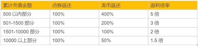 A:测试期间充值点券在游戏上线后100%返还,并按照以下规则额外返还龙币: