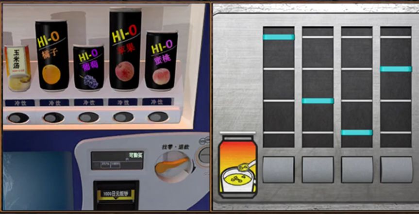 来到零食店点开位置8的零食柜,将饮料的高低顺序一一对应后,得出草莓蜜桃葡萄橙子分别对应的高度为4213,输入密码就可以解开密码箱,通关。