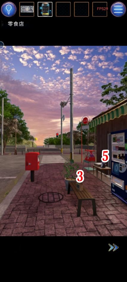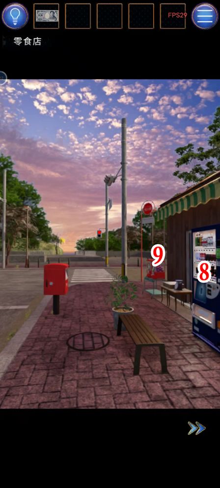 到零食店点击位置8的零售机,用在第一关拿到的1000纸币买随便一盒饮料,得到八枚硬币。