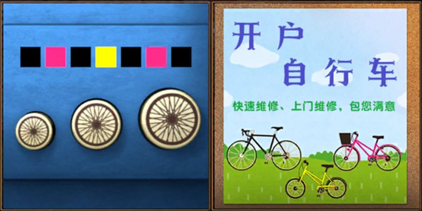 海报上最大的自行车是黑色的,中型的自行车是红色的,最小的自行车是黄色的,结合密码箱上的颜色方块可以得出密码是:黑红黑黄黑红黑=大中大小大中大,输入后打开密码箱就可以得到道具螺丝刀。