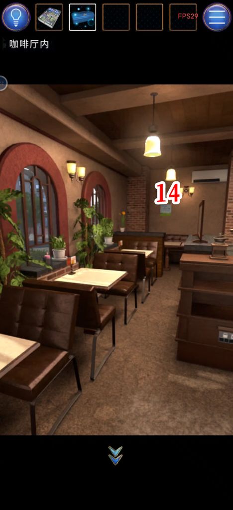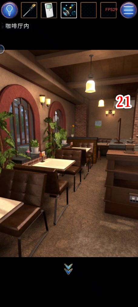 把手电筒电池拆出,给遥控器安上,进入咖啡厅内点击位置21使用遥控器关掉空调。