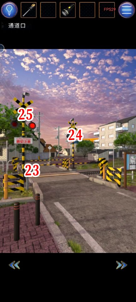 用钥匙打开通道口位置23的箱子,观察箱子的密码和位置24的灯背上的图案相似,再观察位置25通道口红灯的闪烁顺序为左左右左右,进行镜像后得出密码箱密码为右右左右左,输入开锁,道闸上升解锁新地图,通关成功。