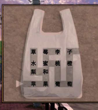 来到海边,在位置30使用水桶打到一桶水,到公路的位置31使用水将污渍洗净,然后在位置32给电缆安上金属零件爬上去(危险动作请勿模仿)拿到塑料袋,在位置31处使用塑料袋,可以得出一条线路:草莓和蜜桃葡萄橙子。