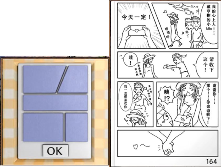 可以看到帽子上的s下写了一个8,刚好s是单词memories的第八个字母,由此推断漫画书上的mio代表的数字不是164就是364,点开漫画书进行交互后来到密码界面,输入164就可以看到漫画的内容。