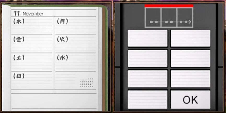 代入后得出2月-5月-7月等同于金曜日月曜日-月曜日月曜日-水曜日月曜日,再根据日程本上的星期排布方式输入密码,就可以打开箱子,获得手表通关。