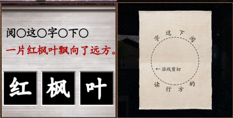 这句话也可以理解为:阅读“这行字”的下方,密码箱上“这行字”这三个字的下方就是红枫叶,输入红枫叶就解开了。写攻略的时候才发现剪开布的动作有点多余,我的解法可能不小心取巧了。