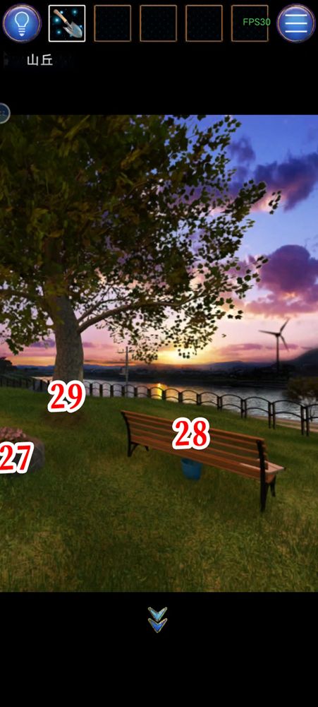 到山丘上的位置27和位置28分别拿到金属零件和水桶,并用铲子挖开位置29的土包,获得一个密码箱。