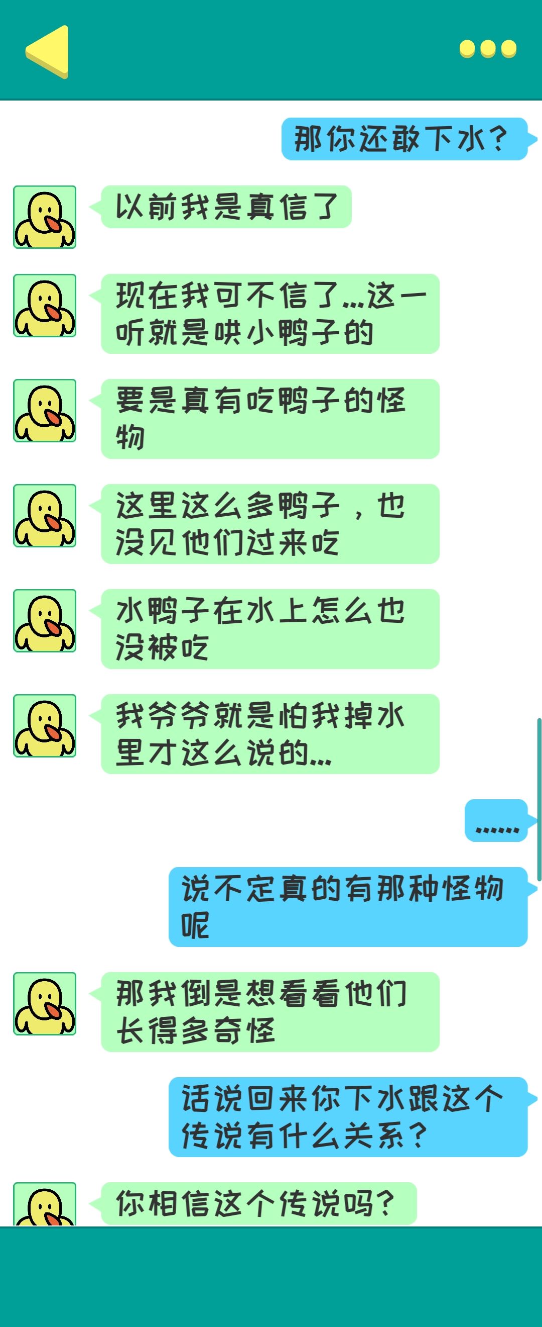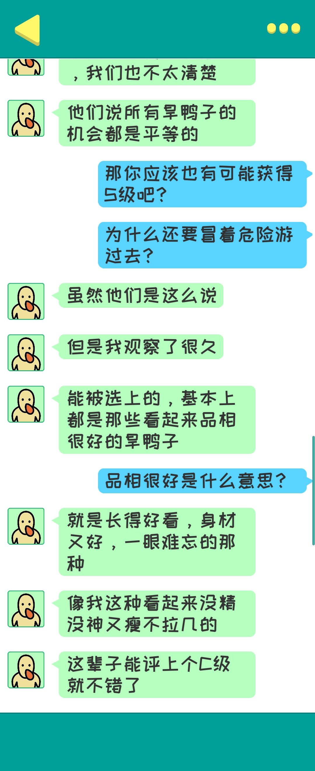 这个游戏的剧情表达很有意思,按照聊天记录的方式进行,主角通过和不同鸭对话慢慢拼凑信息,最终得出真相。不同鸭的性格差异也被塑造的很好。游戏里没有说明最后真相有没有公之于众,甚至没有直接把真相甩出来,而是给玩家线索,让玩家自行推测。