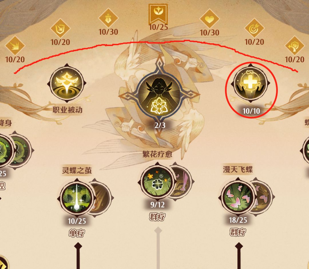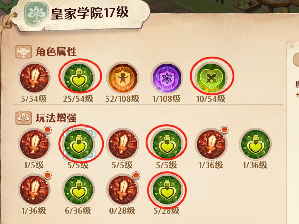学院中学习的属性也可以变肉,优先升满魔神生命和深渊生命,之后是翠语生命,最后是生命和竞技生命,加点如下图红圈所示