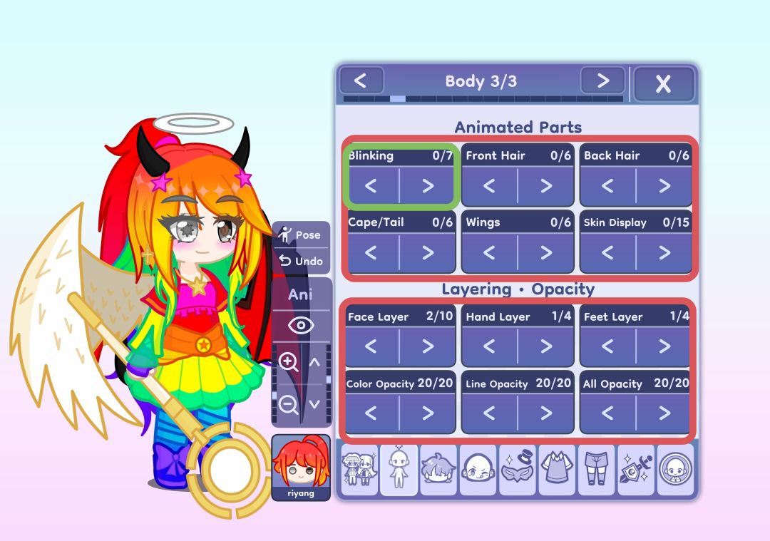 X左右交换、Y上下交换、←→更换装扮、A进入换装界面、↑进入调整界面、↓加动作键进入调色界面。