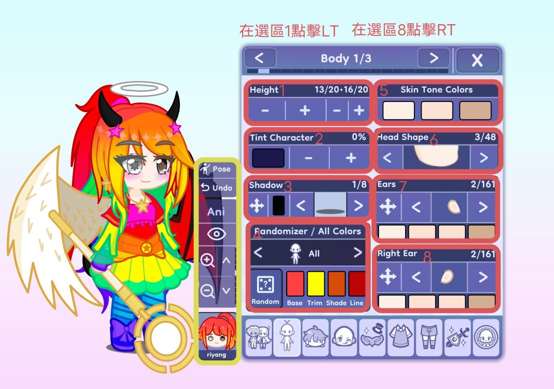 按左摇杆按扭移动角色、B隐藏角色、A显示角色、RT进入上或下选区。