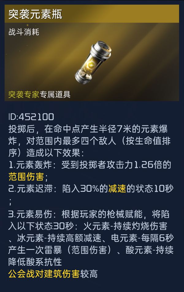 突袭专家精通赋能,可以投掷突袭元素瓶,元素爆炸!炸了的敌人不仅会受到高倍范围伤害,还会带上突袭专家的枪械赋能效果,陷入减速跑不动!