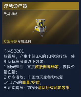 疗愈专家可以放置疗愈诊疗器,在治疗场内的倒地玩家,统统能扶起来!还站着的玩家统统回血回护盾!身上如果还带了敌方的赋能效果,可以短暂免疫。