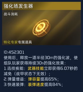 特化专家可以开启强化场发生器,接触到强化波,弹容量提高了、换弹速度快了、敌人武器技能减免了,这个feel倍儿爽!