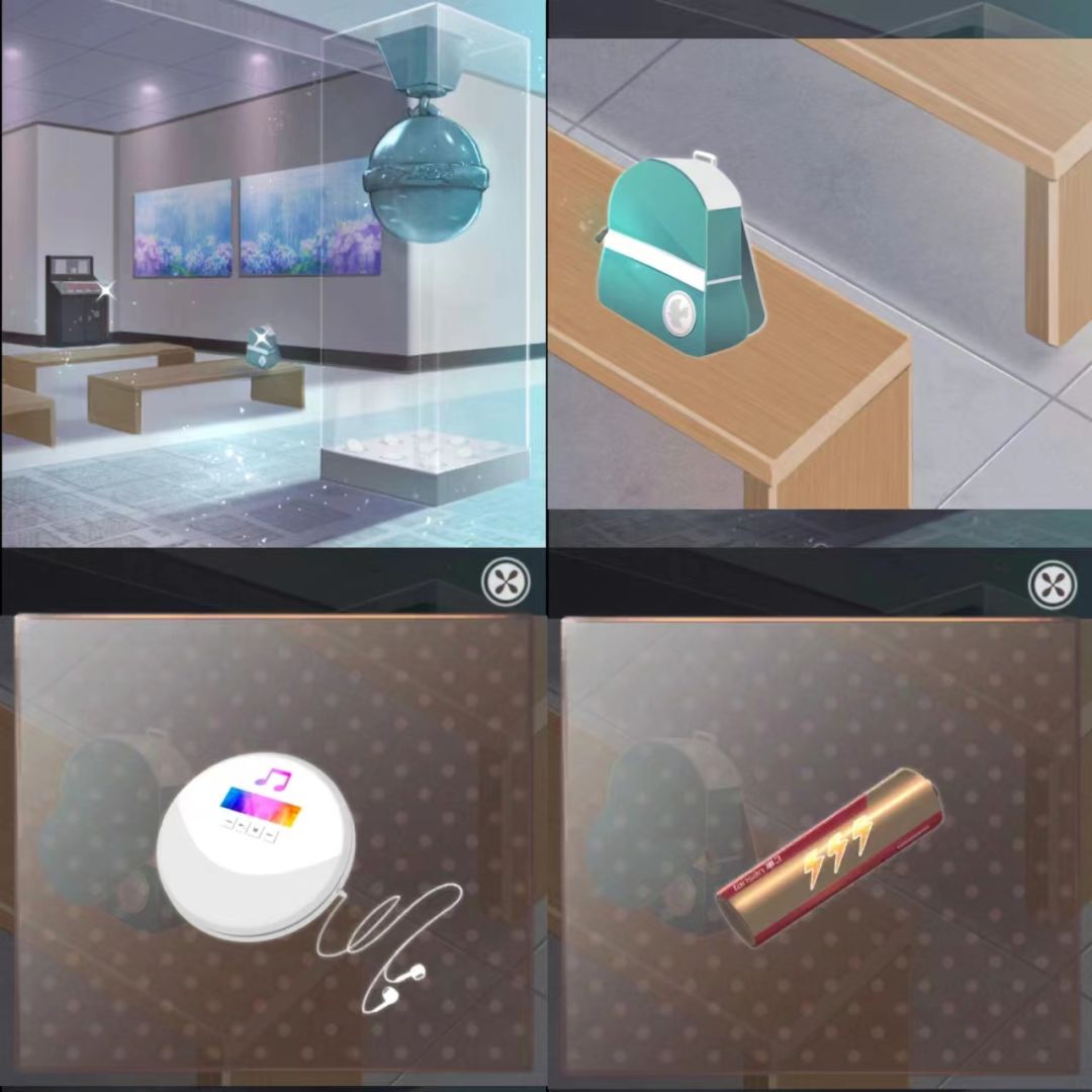 ←↑↑分别拿起礼品店小门后的银铃广场椅子上书包里的CD机 取下电池