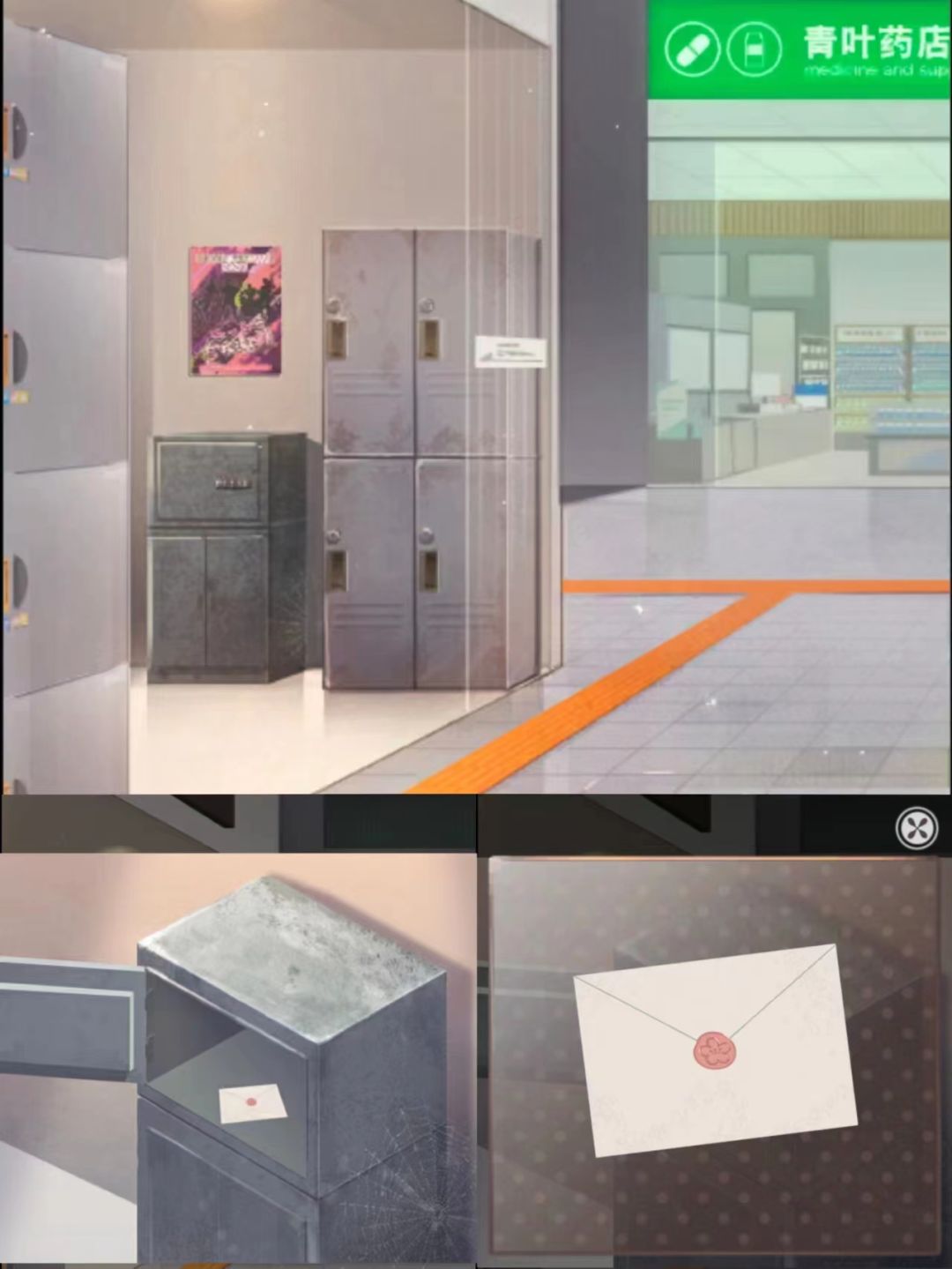 →→到储物柜深灰色柜子上输入密码LIFE 获得一封旧信封 点击信封 获得一封信 再点一次获得纸片 纸片上写着🟦与🟥之间