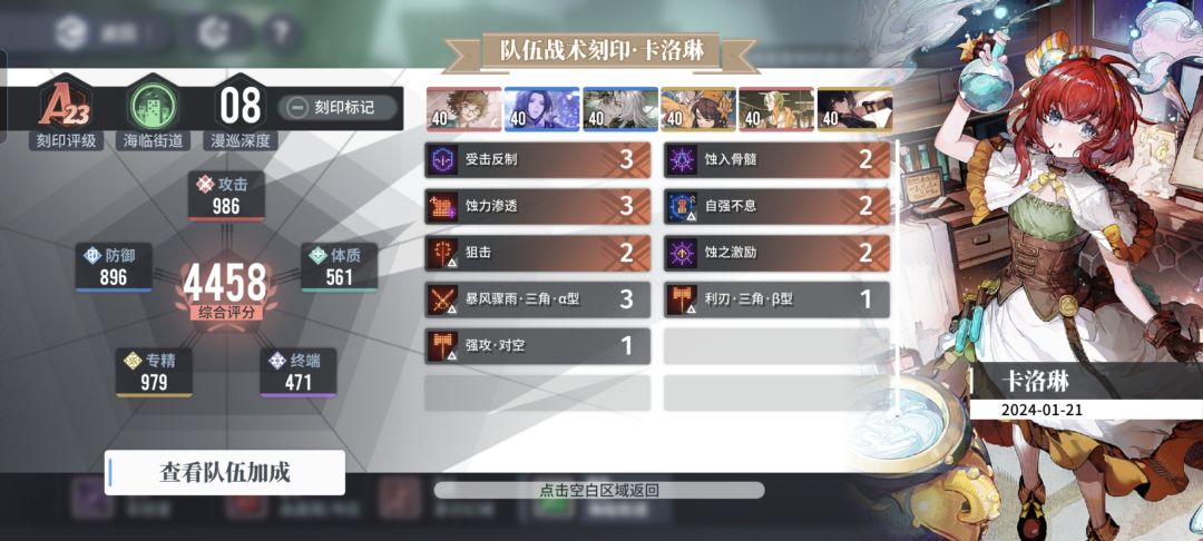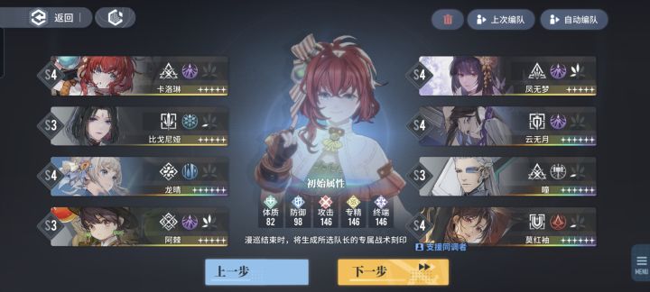 练了一队蚀队阵容,发现肉蚀开荒困难,体质要堆到750、1000的阈值才有战斗力,经常道中就打不过,于是舍弃了体质,开发了输出蚀队,阵容如下