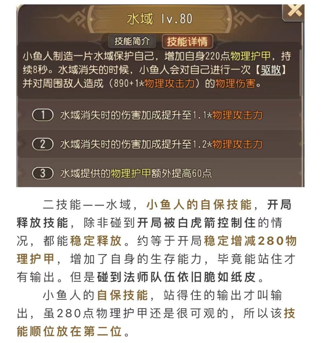 装备缺乏肉装,且自身站位也不算靠后,生存环境并不算舒适,有着暴毙风险的一个前排刺客。虽说有着开局就释放二技能提供高额护甲,但是面板坦度也不算高,且魔抗真的很低,是非常惧怕法师的一名英雄,克制小鱼人用法师十分轻松。