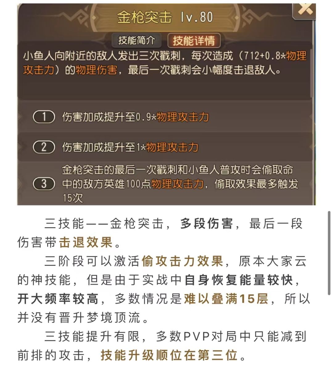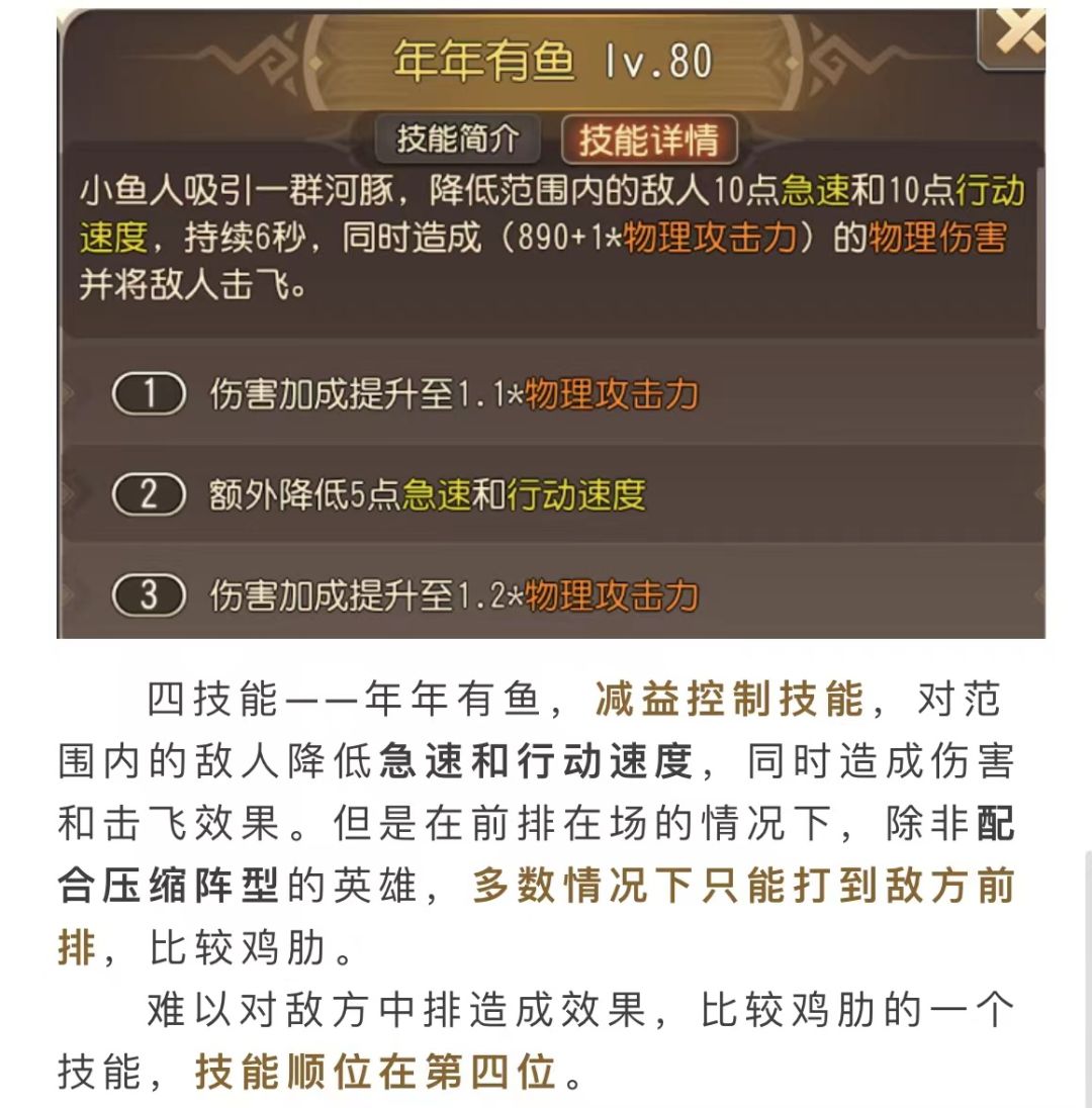 小鱼人竞技场方向来看,作为一名前排刺客,缺乏自保能力,控制技能局限性较大,输出也比较吃环境(敌方控制技能少),目前体验下来仅进攻使用会舒服一些。小鱼人梦境方向来看,原本以为要封神的减攻击,结果因为自身减攻频率较低,减攻击BUFF叠加过慢,导致并没有在梦境中有出色的表现。培养电魂的队长可以安心了,小鱼人并没就业梦境,更别说替代电魂了。整体来看,这次的两星英雄小鱼人目前还是偏弱的,二星箱子抛开老英雄的话,目前环境下可能做小精灵是一个不错的选择。小鱼人就看策划愿不愿意去抬一手了,没有加强补丁的情况下,白嫖等歪就好了。