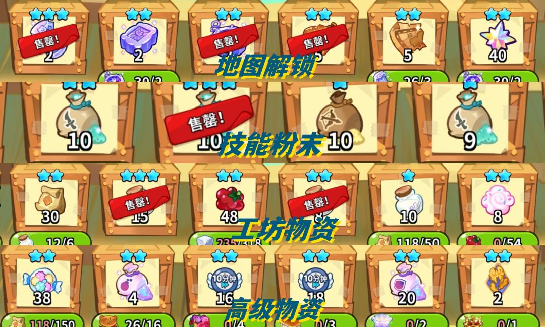 高级物资区域的物资是随机刷新的,经验星星糖、高级技能粉末、加速券、配料以及饼干灵魂石等等都有可能刷,但兑换这类物资需要的资源往往也不会是特别容易生产的。
