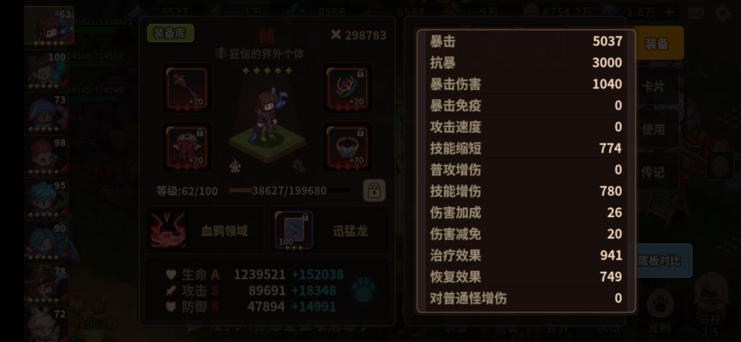 暴击值经过测试,350层以后就不再衰减了,大概1000值转换为21%暴击率,也就是差不多50值转换1%,性价比一般的属性,暴击率最高堆200%,暴击值-抗爆值=最终暴击值,特殊情况除外,比如鸡卡的50%暴击就非常特别,纯白板只需要一张鸡卡几乎看不到不暴击的白字