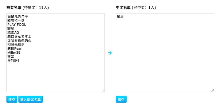 以上两部分名单去重后共【12】人,按10%中奖率抽【1】个~~通过(百度到的)某抽奖网页进行抽奖,结果如下: