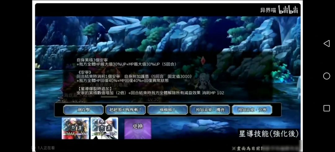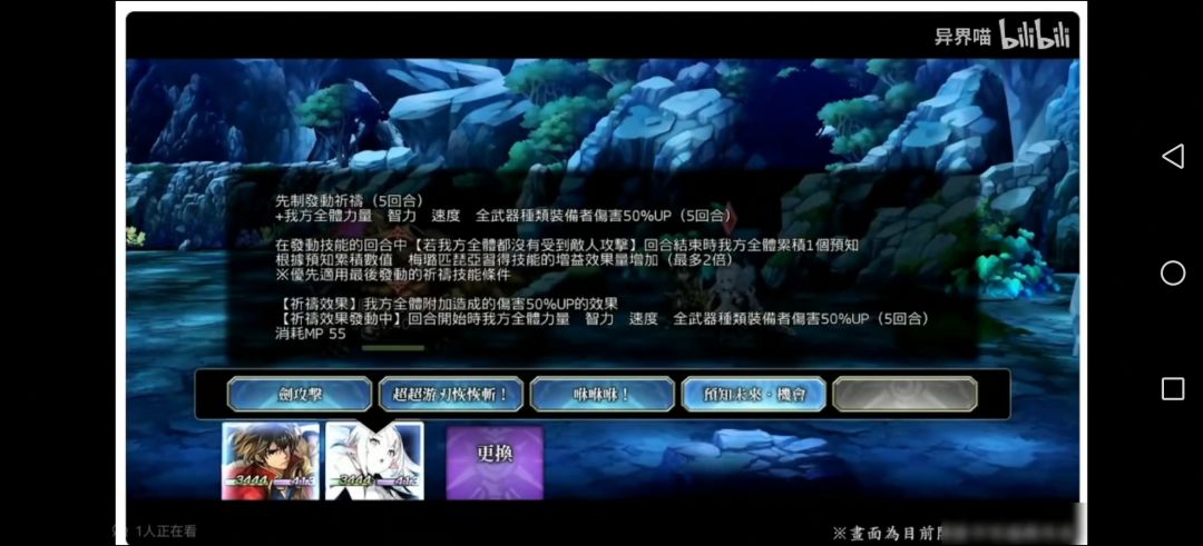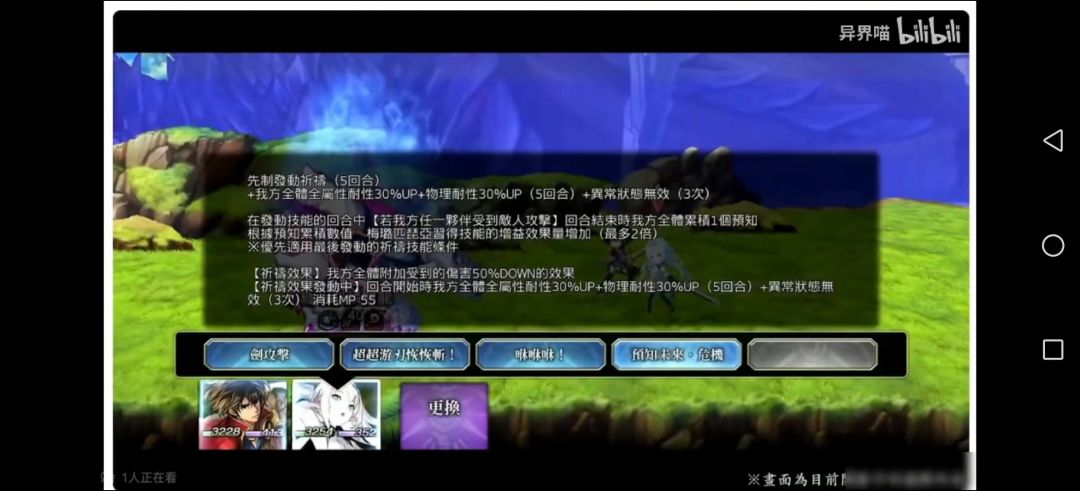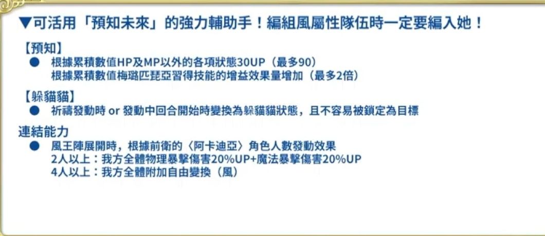 当任一己方被攻击时,蓄积【预知】,每珠获得全属性30up,同时提高祈祷效果,【预知】蓄积3珠后最终效果为60%物耐,60%全属耐,50%减伤