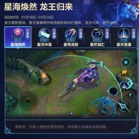 中路还有另外一位热门英雄,那就是重做后的奥瑞利安·索尔!首先,索尔是一名偏向后期爆发的法师,成型速度相比其他法师英雄较慢,所以前期以刷被动星尘为主,同时看准时机游走支援。