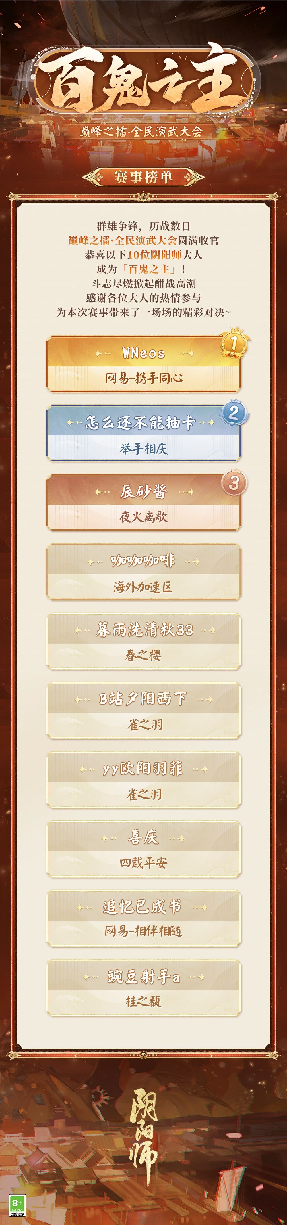群雄争锋,历战数日,巅峰之擂·全民演武大会今日圆满收官。恭喜以下10位阴阳师大人成为「百鬼之主」!斗志尽燃掀起酣战高潮,感谢各位大人的热情参与,为本次赛事带来了一场场的精彩对决。