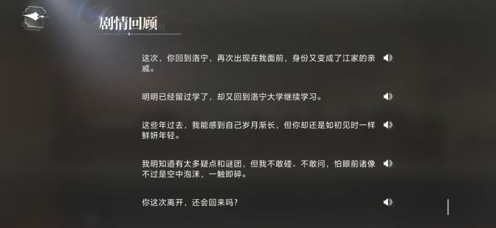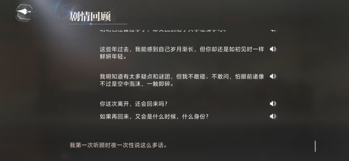 第一个副本我就一直没有开门,谁谁也不相信,主打一个一问三不知),完成了两个副本任务两个顾时夜的支线任务。妈呀,顾时夜的第二个支线任务简直了,破碎感有点强,先不说在支线二里库库亲、恋爱感体验较高这个话题,到后面顾时夜的一番话弄得我有点不知所措,有点寿命论感觉。他能感觉到他岁月渐长,但每次见到“我”的时候“我”依然年轻,容貌不曾改变过。