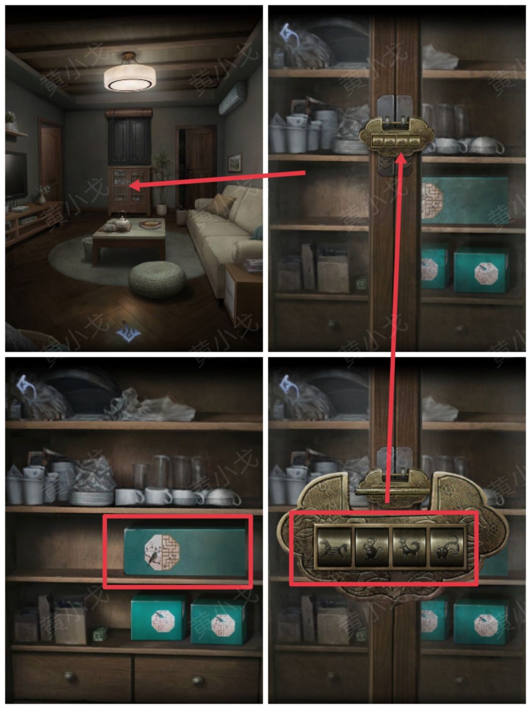 1.(客厅-幻3)点击柜子上的锁,根据占卜茶杯上的线索,调整密码锁对应的生肖:马猴狗虎(三个符号组成字:从左到右-午申戌寅);打开柜子,点击里面的空盒子