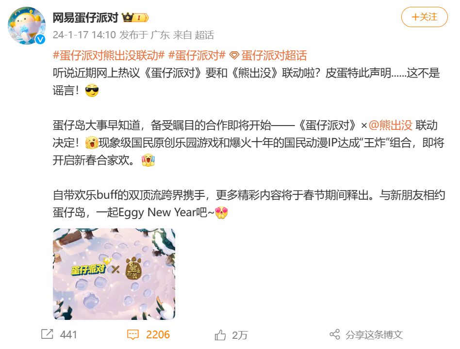 追根溯源,这次热度暴涨的主要原因,大概是《蛋仔派对》与《熊出没》联动的官宣消息,在用户需求高涨的寒假节点成功引爆了社区话题度。