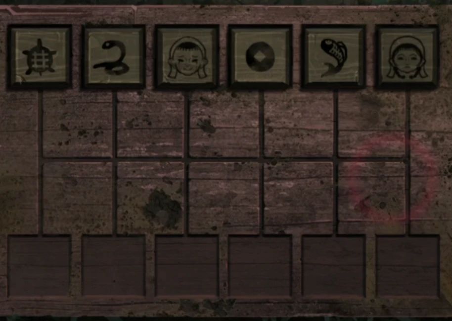 暂时没有其他地方了先离开密室,在屋里查看一下录音机拿走录音带,出门查看右边棚子,剧情后木偶都消失了,后面靠墙拿走铁锹,现在就可以挖了,在婆婆旁边挖一挖拿到一个盒子,注意盒子上面的图案是一闪而过的,需要记住然后调整顺序,米雪的顺序是如下图的,但是不知道这个是不是所有人顺序一样,完成后拿到铁丝枪和有洞的照片。