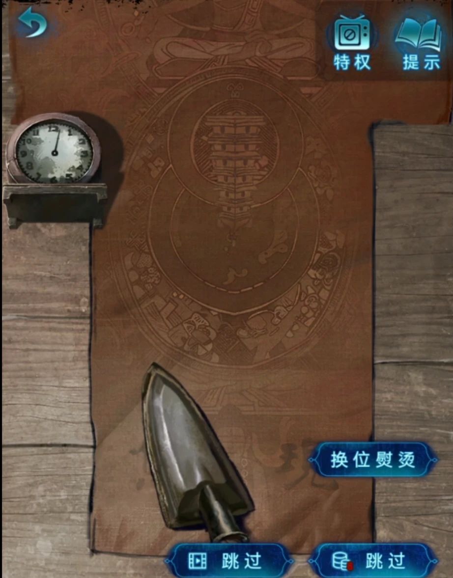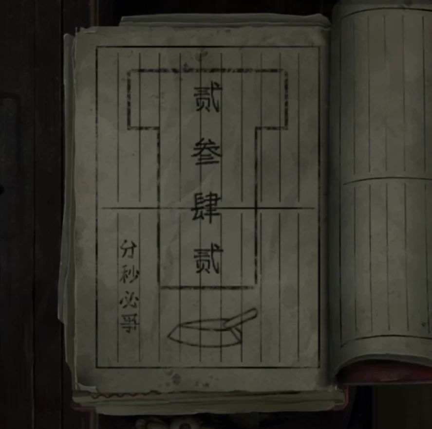 查看一下被扔在桌子上的书,第三页拿到一张画着六葬菩萨的金箔,上楼把金箔放在右边的神龛里,果然第二章拿到唢呐的才是小奚啊,自动吹奏后拿到一块布帛,来到小奚家,把熨斗秒表布帛都放在左边的桌子上就能开始熨烫了,这里记的要看左边秒表时间,依次是2秒换位、3秒换位、4秒换位、2秒换位,时间都正确的话就能拿到帛画了。