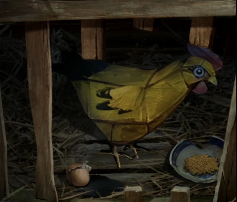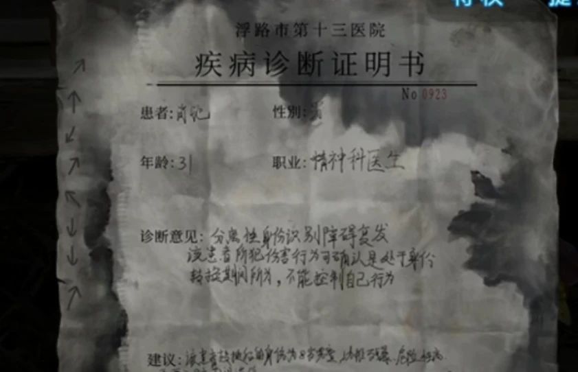 对前面的簸箕使用头套获得一堆小米和一堆砂石,还有砂石是米雪没想到的,在中间的地面上篱笆部分拿到木材,查看左边门旁边的鸡笼,给纸坤喂小米就能获得裂开的蛋,查看一下蛋里的纸条是一张诊断书,诊断书的左侧还画了几个箭头,记下来右上-上-左下-右上-左上-下-下-右上,注意除了诊断书外蛋壳也是可以拿走的。