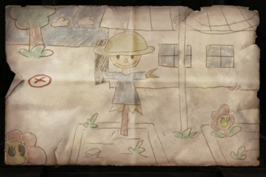 查看左边的镜子,把燕子放在左下角就能玩个擦手印小游戏了,其实就是在镜子上出现手印时候点一下就行,难度不大点快点完全来得及,完成后下面暗格打开拿到一张旧剪报,剪报下面还有一根车链子和一张儿童画,儿童画在左边大树下面画了个x,仔细看这个的稻草人和电线杆就是我们刚刚门外看到的,也就是说在左边的缠着红布条的树下面有道具。