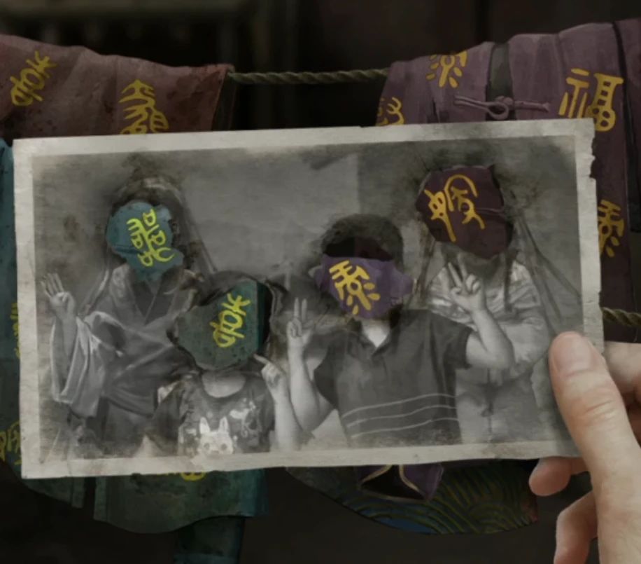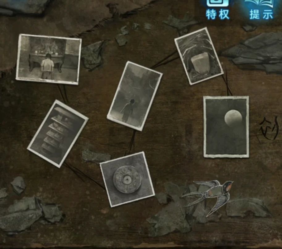 右边的神龛拿到秒表,提示需要金身和哀乐,左边箱子上有个收音机还没有线索,收音机的旁边可以玩拼图,注意这里要在屋里场景直接点收音机的左侧,如果点的是收音机就无法查看咯,拼图顺序就是外面电线杆上贴的内容,依次是天-地-夜游郎-寻阴-灵塔-菩萨,从右边标注了鬼画符的开始,第一个是天选择有风筝和月亮的照片,第二个是地选择墓碑照片,第三个是夜游郎选择小男孩背影,这张可以用排除法确定,第四个是寻阴需要罗盘所以选择罗盘,第五个是灵塔选择塔,第五个是菩萨,选择小孩子在神龛跪拜的背影,完成后风筝就飞了出来变成了燕子。