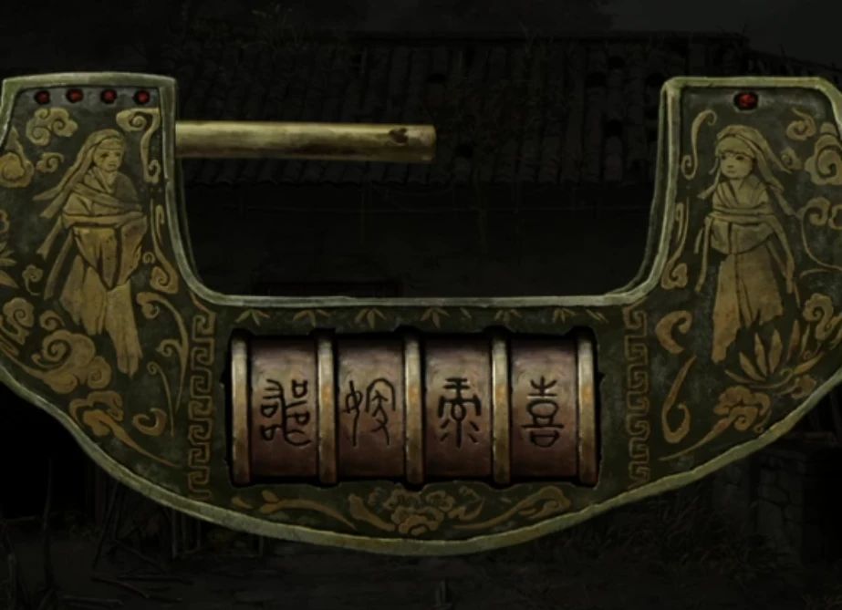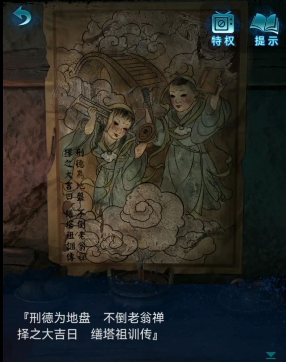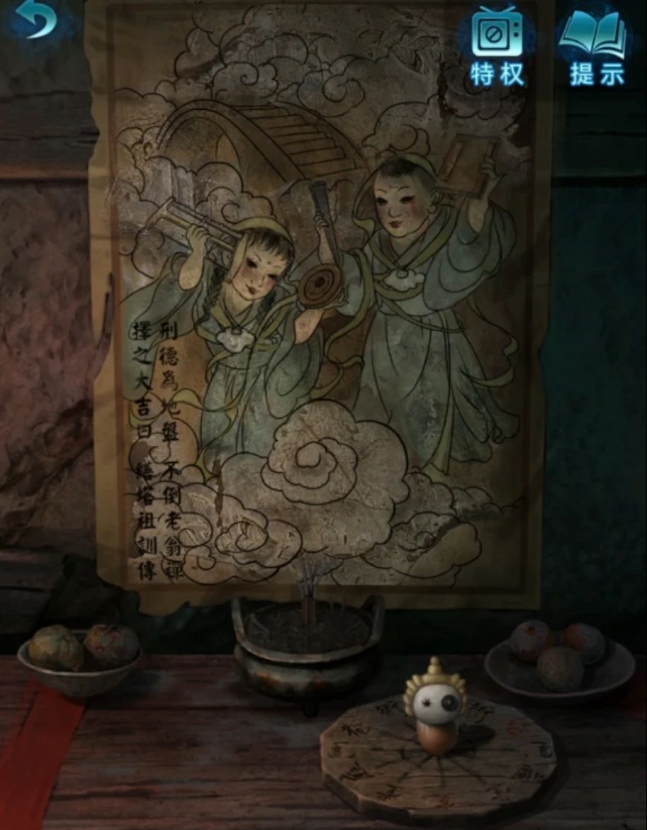 暂时没有什么线索了,回到村口找婆婆,给婆婆看圆盘得知这就是刑德,等婆婆补好了就获得了刑德盘,再次回到密室,在后面挂画的桌子上使用刑德盘,然后依次使用鸡蛋壳、胶水、碎石子、六葬娃娃头做成不倒翁后,后面画里的孩子就把手里的书扔下来了。