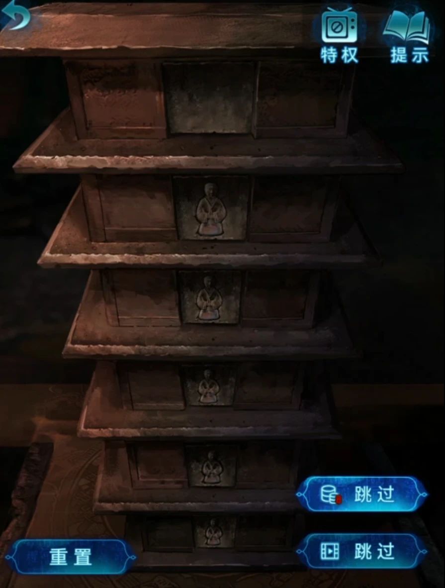 再次回到密室把帛画放在地面的石板上,塔变成了具象化的,需要将所有小人都调整出来,这里从倒数第二个开始往上点就能完美调整了,最下面的是联动最上面,但是最上面的却不联动任何一块,所以最后调整最上面的即可哦~将所有石门都调整为有小人出现后就能......又卡住了!使用铁锹打开最上面的机关就能拿到八卦镜,剧情翻转本章结束~