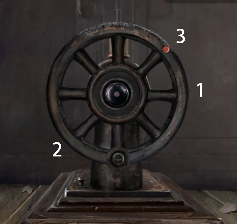 远处的缝纫机查看一下有点眼熟,拿出录音带发现形状和红色位置都很类似,拉一下录音带的左下角发现录音带先旋转到最右边,然后是左下角,最后回到右上角,那么查看一下缝纫机,将轮子的小红点先转到右边,然后转到左下角,最后转回右上角,缝纫机轮子里就掉下来一瓶胶水,这可有点离奇了。