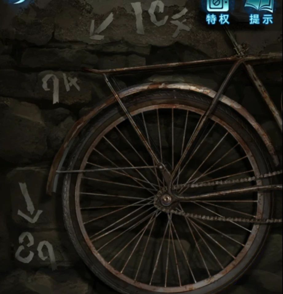 出门先给右边的自行车轮装上车链子,然后上面贴的纸条就甩了出来,按照箭头顺序的话组成了IC-x→94→89,考虑到应该都是数字,所以第一个应该是104,这几个数字结合屋里的收音机就能知道是频道了,顺序是104-94-89。注意车轮下面还有一根铁丝翘了起来,可以拿走,正好就用这个当天线吧。