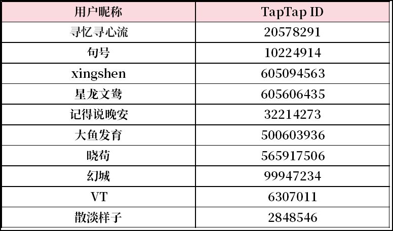 恭喜以下道友获得【100元京东卡*1】,我们将通过 TapTap 私信向您发放奖品。