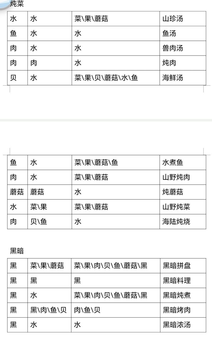 烹饪方面整理了一些食谱,大份食物就是三种食材任意一种替换成绿品质食材,高级是两种替换,顶级是三种都是高品质食材