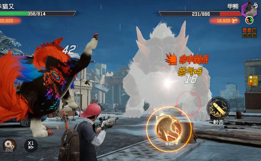 通过射击异兽加快上场伙伴技能能量的积蓄,缩短技能CD加速释放。在异兽出现【弱点】标识后,点击弱点能施加更高的伤害。
