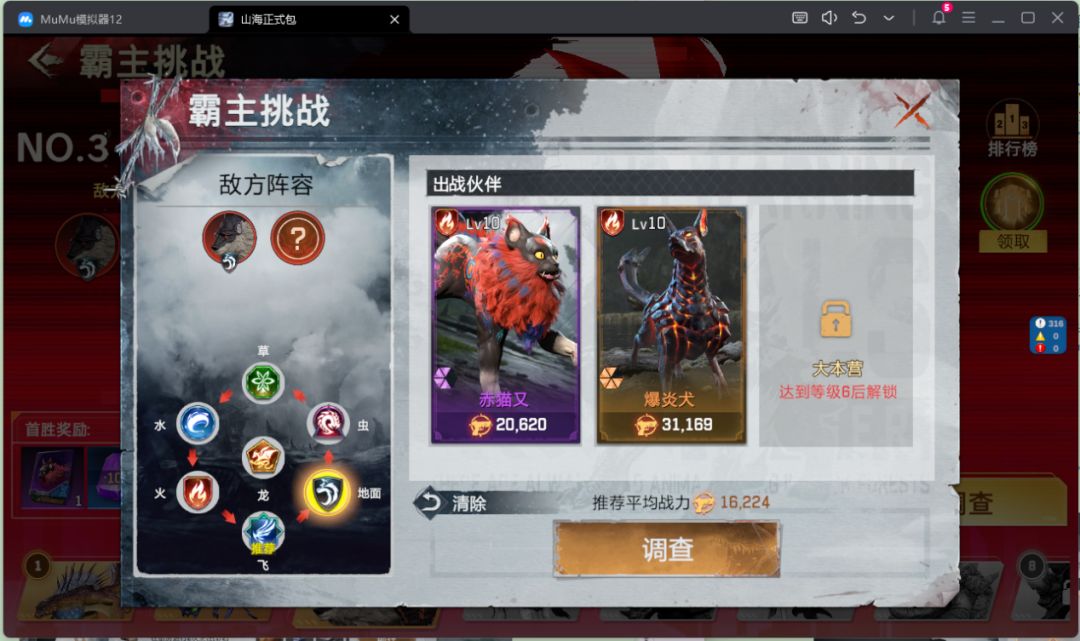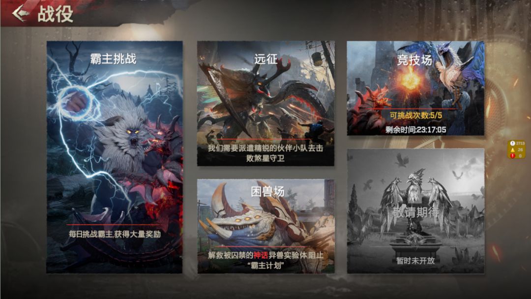 个人PVE副本,通过挑战获得高额奖励。大本营提升至8级后开启,每日开启的属性不同,产出高品阶异兽。